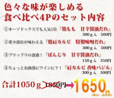 | 内容量 | 1050g(鶏もも肉 甘辛醤油300g) (肩カルビ 特製みそ300g) (ぼんじり 甘辛醤油150g) (肩カルビ 香味バジル300g) |