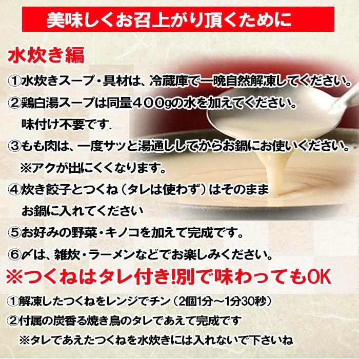 | 内容量 | 水炊きセット(鶏スープ400ml・つくね5個入り×2・若鶏モモ肉切り身300g×2) 炊き餃子8個入り×2) |